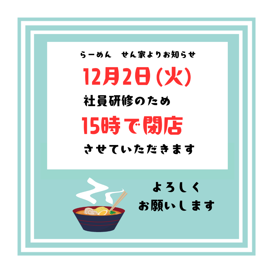 お知らせ 2025 12/01 お知らせ らーめんせん家山元店 らーめん せん家さんが社員研修のため閉店時間が変わる日があります。 日時:2025年12月2日(火) 15時で閉店 どうぞご了承くださいませ。 お知らせ らーめんせん家山元店 【終了間近です】